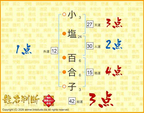 小(3画)塩(24画) 百(6画)合(6画)子(3画)