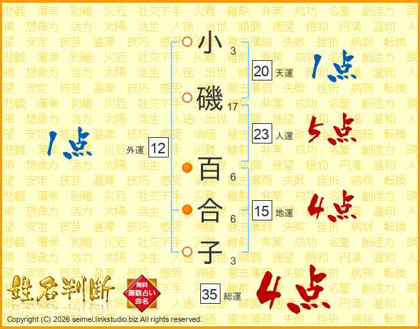 生活面を象徴する運勢です。外部から受ける影響力を表し、結婚運、家庭運や職場、環境への順応性を表します。総運から人運を引いた画数。姓や名が1文字の場合を除く。