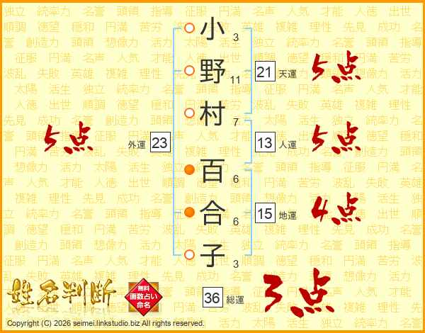 小野村百合子さんの総運は36画の3点!