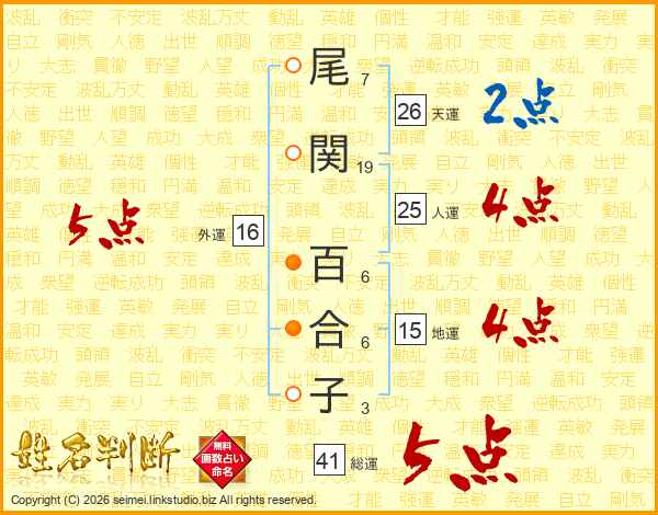 尾関百合子さんの総運は41画の5点!