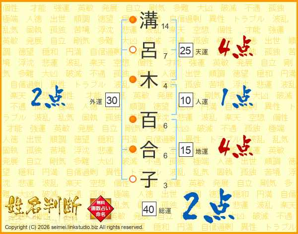 生活面を象徴する運勢です。外部から受ける影響力を表し、結婚運、家庭運や職場、環境への順応性を表します。総運から人運を引いた画数。姓や名が1文字の場合を除く。