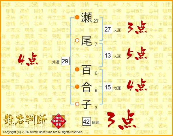 瀬尾百合子さんの総運は42画の3点!