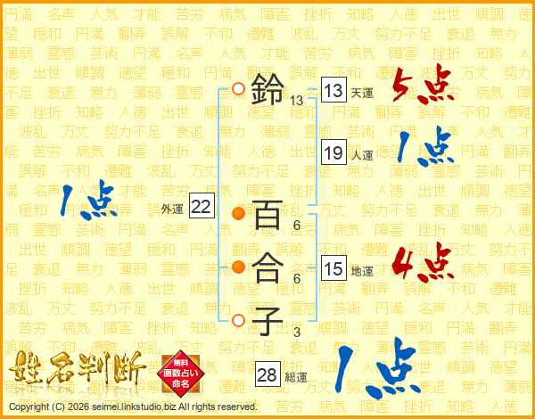 生活面を象徴する運勢です。外部から受ける影響力を表し、結婚運、家庭運や職場、環境への順応性を表します。総運から人運を引いた画数。姓や名が1文字の場合を除く。