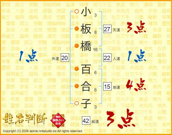 小(3画)板(8画)橋(16画) 百(6画)合(6画)子(3画)
