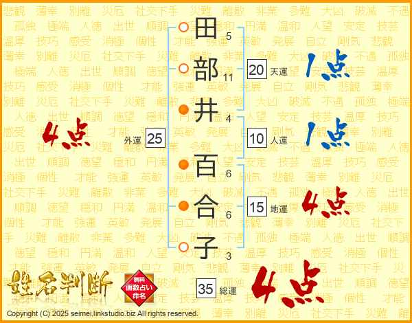 生活面を象徴する運勢です。外部から受ける影響力を表し、結婚運、家庭運や職場、環境への順応性を表します。総運から人運を引いた画数。姓や名が1文字の場合を除く。