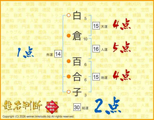 生活面を象徴する運勢です。外部から受ける影響力を表し、結婚運、家庭運や職場、環境への順応性を表します。総運から人運を引いた画数。姓や名が1文字の場合を除く。