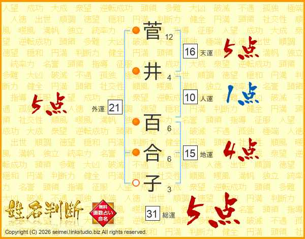 菅(12画)井(4画)  百(6画)合(6画)子(3画)