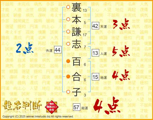 裏(13画)本(5画)謙(17画)志(7画) 百(6画)合(6画)子(3画)