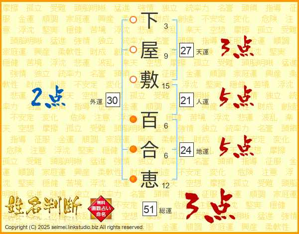 下(3画)屋(9画)敷(15画) 百(6画)合(6画)恵(12画)