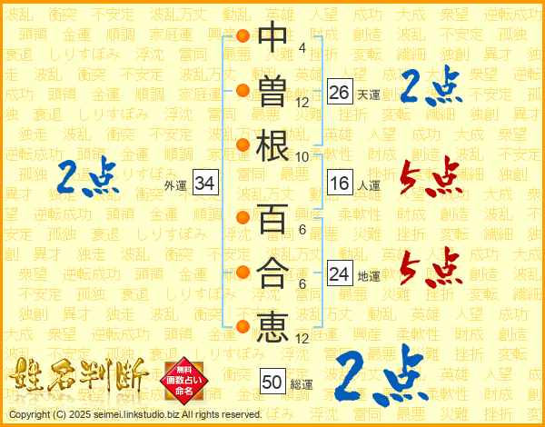 中(4画)曽(12画)根(10画) 百(6画)合(6画)恵(12画)