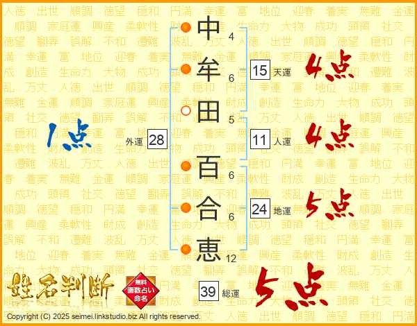 中(4画)牟(6画)田(5画) 百(6画)合(6画)恵(12画)