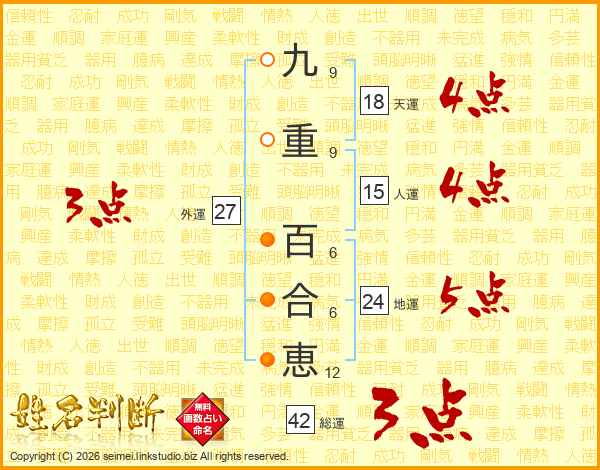 九(9画)重(9画) 百(6画)合(6画)恵(12画)
