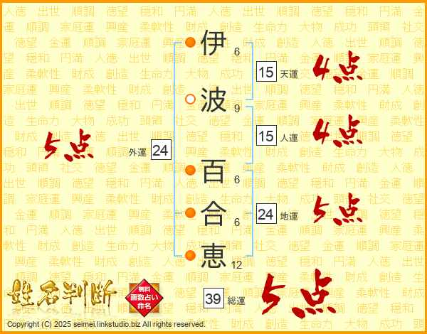 伊(6画)波(9画) 百(6画)合(6画)恵(12画)