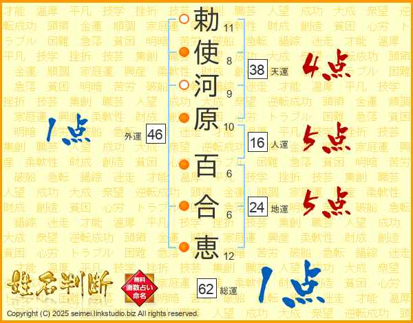勅(11画)使(8画)河(9画)原(10画) 百(6画)合(6画)恵(12画)