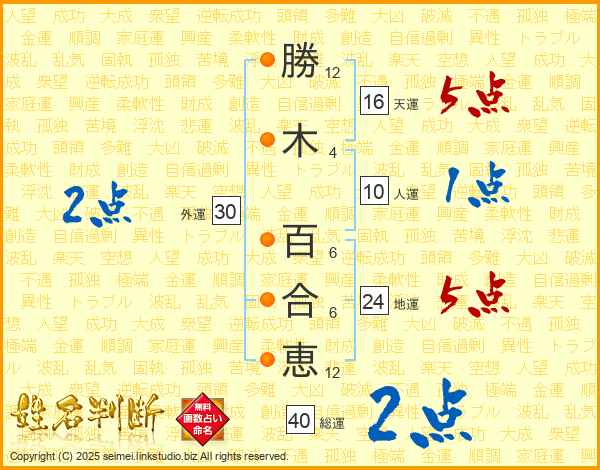 勝(12画)木(4画) 百(6画)合(6画)恵(12画)
