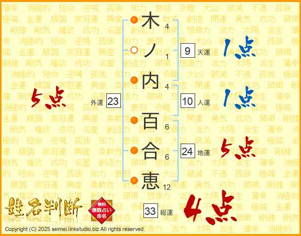 木(4画)ノ(1画)内(4画) 百(6画)合(6画)恵(12画)