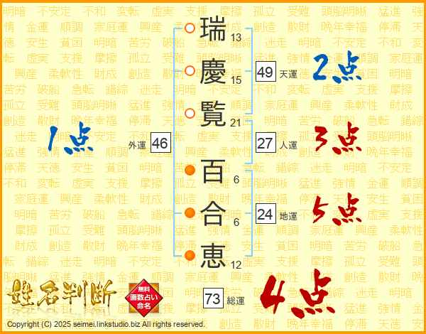 瑞(13画)慶(15画)覧(21画) 百(6画)合(6画)恵(12画)