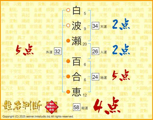 白(5画)波(9画)瀬(20画) 百(6画)合(6画)恵(12画)