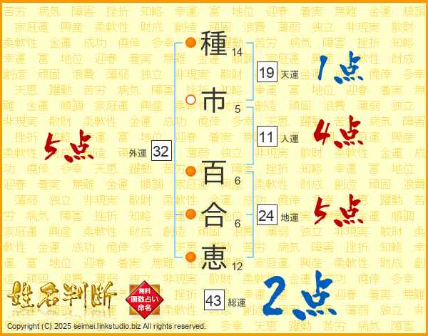 種(14画)市(5画) 百(6画)合(6画)恵(12画)