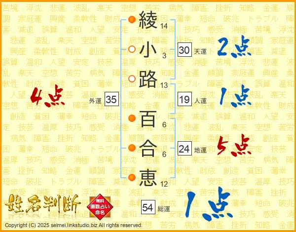 綾(14画)小(3画)路(13画) 百(6画)合(6画)恵(12画)