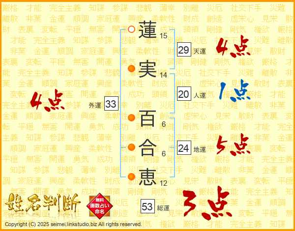 蓮(15画)実(14画) 百(6画)合(6画)恵(12画)