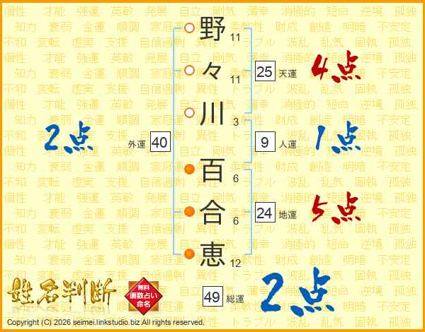 野々川百合恵さんの総運は49画の2点!