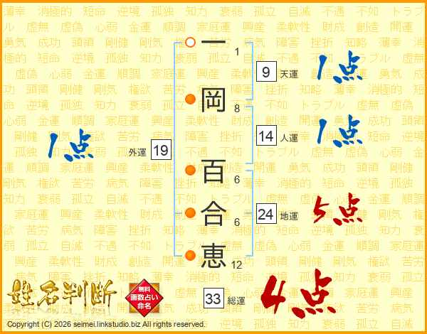一(1画)岡(8画) 百(6画)合(6画)恵(12画)