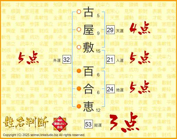 古(5画)屋(9画)敷(15画) 百(6画)合(6画)恵(12画)