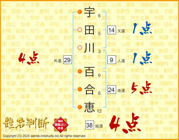 宇田川百合恵さんの総運は38画の4点!