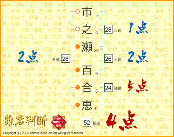 市(5画)之(3画)瀬(20画) 百(6画)合(6画)恵(12画)