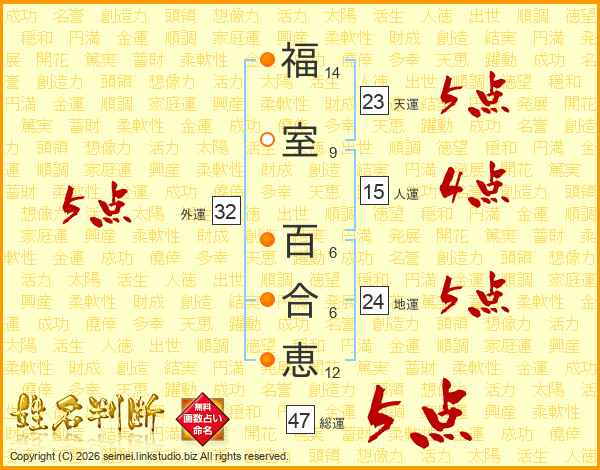福(14画)室(9画) 百(6画)合(6画)恵(12画)