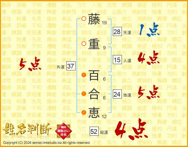 藤(19画)重(9画) 百(6画)合(6画)恵(12画)