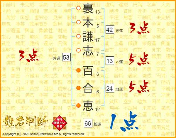 裏(13画)本(5画)謙(17画)志(7画) 百(6画)合(6画)恵(12画)