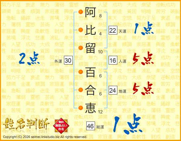 阿(8画)比(4画)留(10画) 百(6画)合(6画)恵(12画)