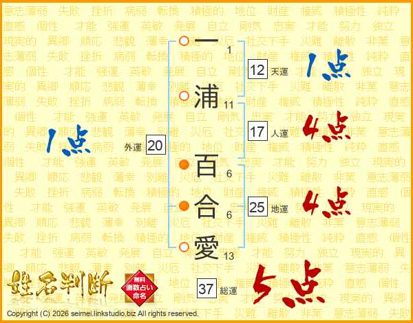 一浦百合愛さんの総運は37画の5点!