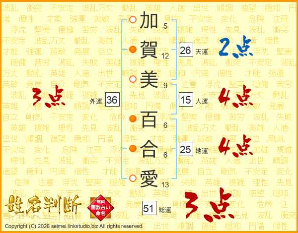 加賀美百合愛さんの天運は26画の2点!