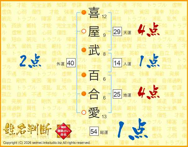 喜(12画)屋(9画)武(8画) 百(6画)合(6画)愛(13画)