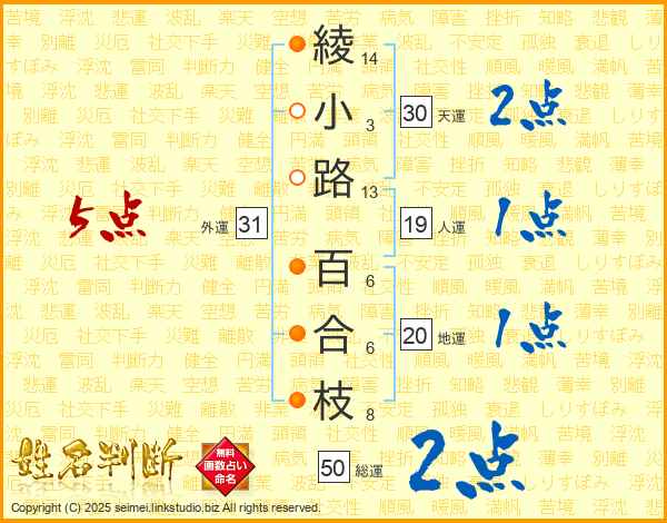 綾(14画)小(3画)路(13画) 百(6画)合(6画)枝(8画)