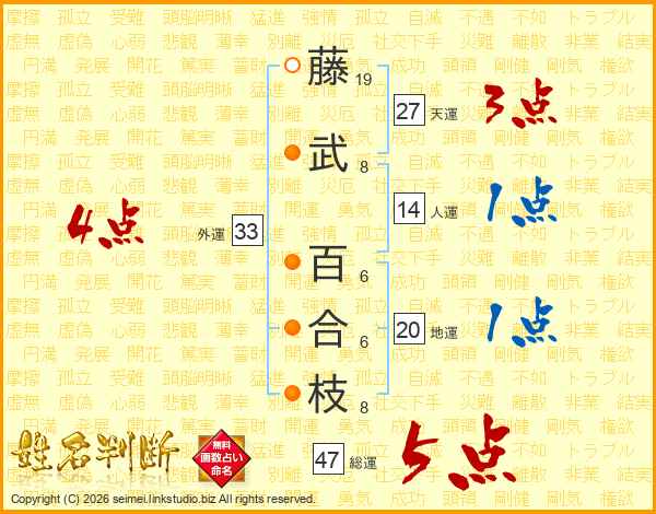 藤(19画)武(8画) 百(6画)合(6画)枝(8画)