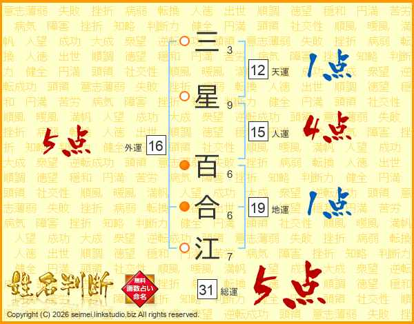 生活面を象徴する運勢です。外部から受ける影響力を表し、結婚運、家庭運や職場、環境への順応性を表します。総運から人運を引いた画数。姓や名が1文字の場合を除く。