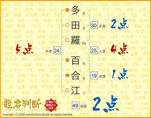 多(6画)田(5画)羅(19画) 百(6画)合(6画)江(7画)