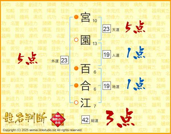 宮(10画)園(13画) 百(6画)合(6画)江(7画)