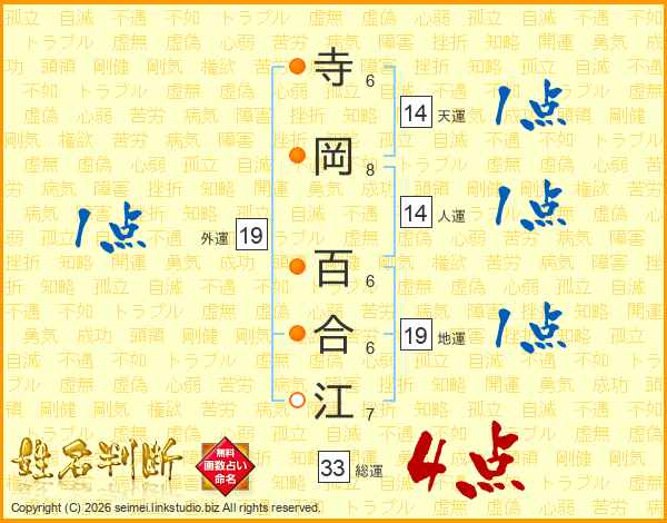 寺(6画)岡(8画) 百(6画)合(6画)江(7画)