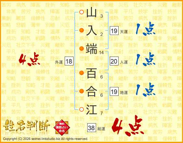 生活面を象徴する運勢です。外部から受ける影響力を表し、結婚運、家庭運や職場、環境への順応性を表します。総運から人運を引いた画数。姓や名が1文字の場合を除く。