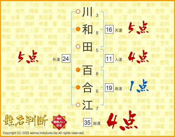 川(3画)和(8画)田(5画) 百(6画)合(6画)江(7画)