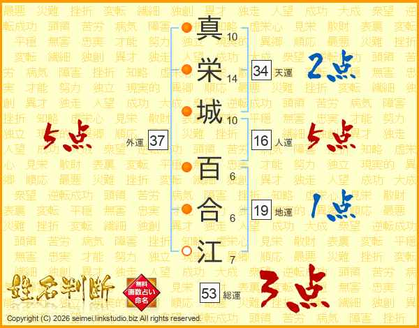 真(10画)栄(14画)城(10画) 百(6画)合(6画)江(7画)