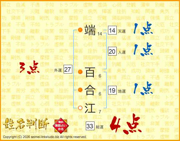 生活面を象徴する運勢です。外部から受ける影響力を表し、結婚運、家庭運や職場、環境への順応性を表します。総運から人運を引いた画数。姓や名が1文字の場合を除く。