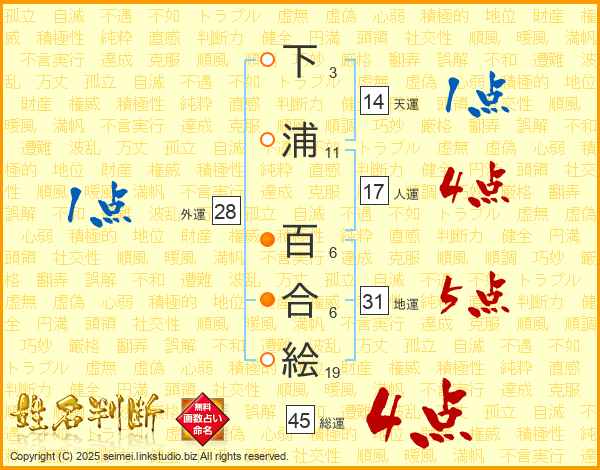 生活面を象徴する運勢です。外部から受ける影響力を表し、結婚運、家庭運や職場、環境への順応性を表します。総運から人運を引いた画数。姓や名が1文字の場合を除く。