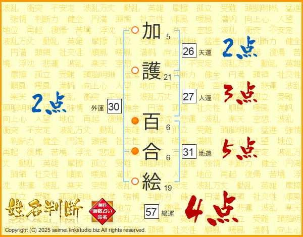 加護百合絵さんの総運は57画の4点!
