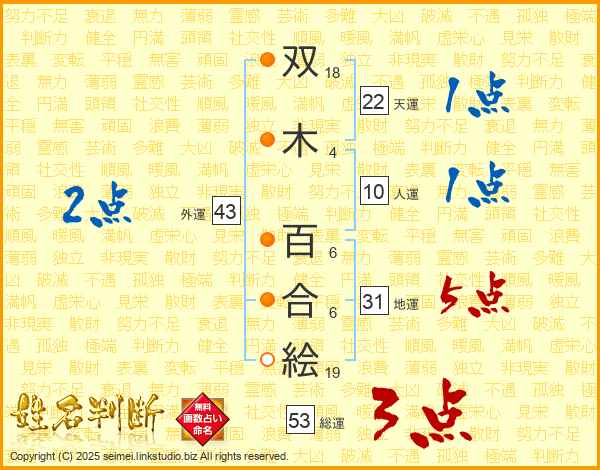 あなたの人生を表す1番重要な運勢です。生涯を通じて影響する総合運となり、主に50歳以降の晩年期に影響を及ぼします。苗字と名前の合計画数。